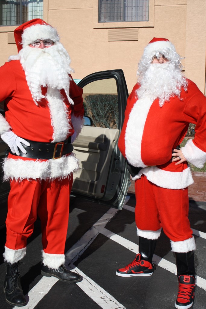 This is my dad and my son. ๐ Aren’t they the coolest Grandpa and Grandson Santa on the planet? I think so. These Santas were dressed and ready to hand out candy canes and entertain people. They also had another clear mission: